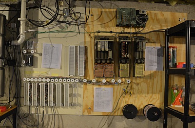 ![]() | Celler 1A2, 641A (left) and 620A2 (right) Key Service Units (KSU) The 620A2 contains 3 working 400H, and 2 working 401A intercom KTUs (Key Telephone Units, those blue or gray rectangular cards in the upper sections. It takes 1 KTU for each phone line). The other KTUs are just to fill empty slots. Currently the 641A KSU is not being used. Eventually I hope to get the 409A KTU music on hold working. The small black box, upper center, contains 2 relays to operate the A1 circuits for the non-key phones throughout the house. Large View |