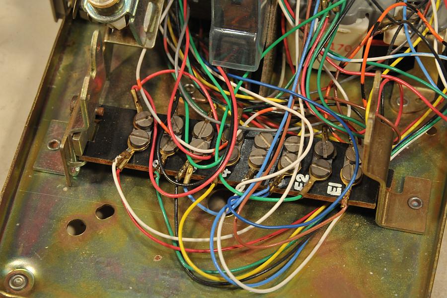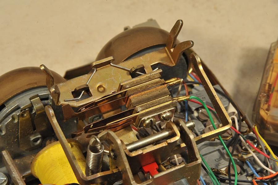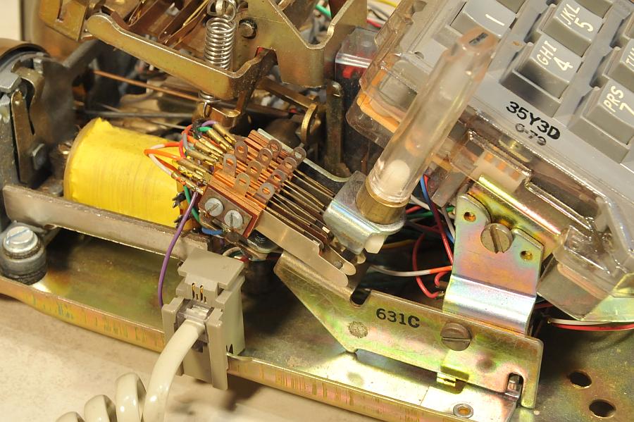 Closeup of the internal line switch. If the switch is pressed down a set of contacts is engaged which can be wired for signaling another station. 631C is the part number of this switch.