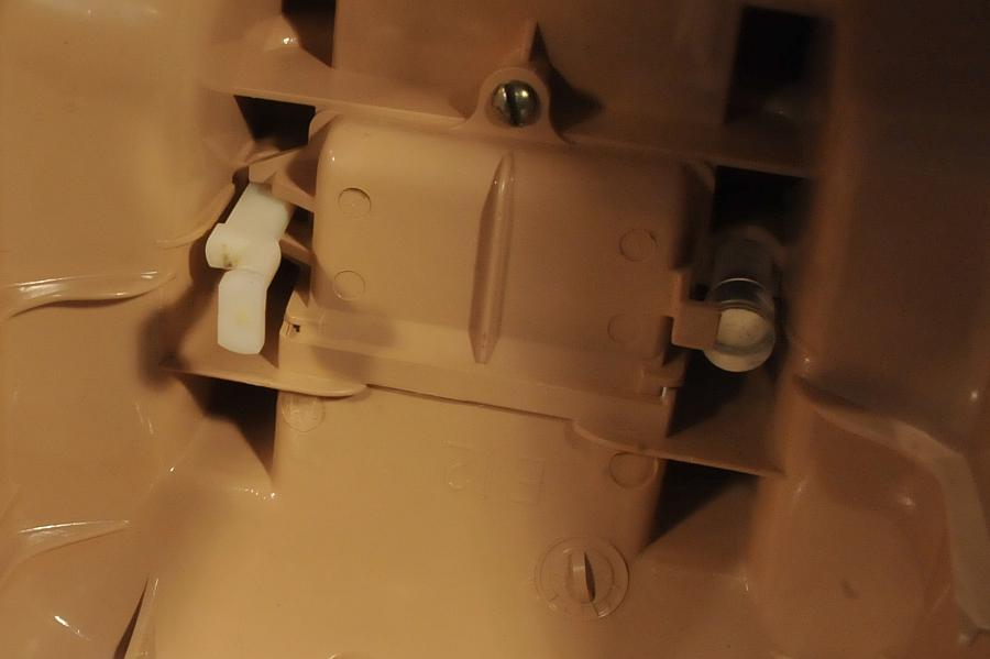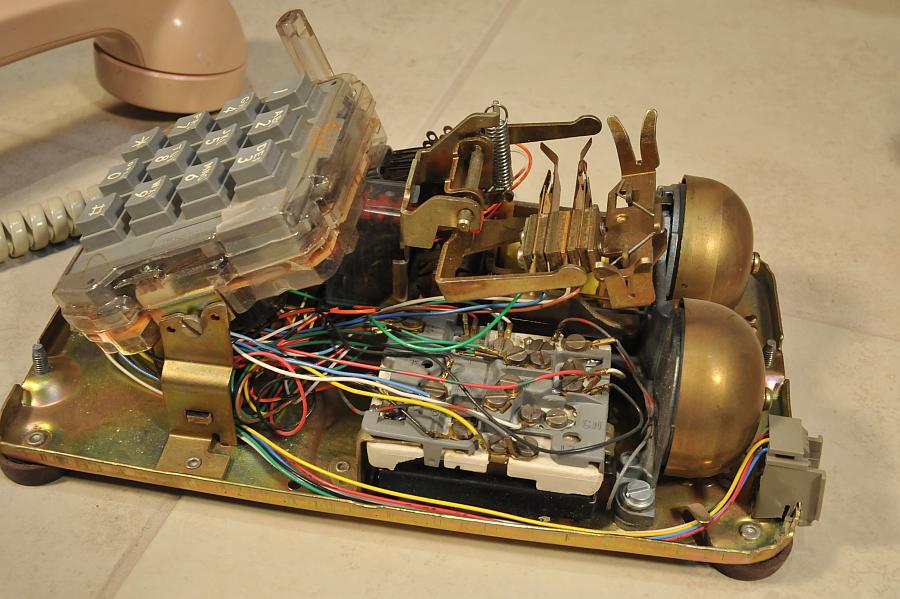 Underside of the housing. The white plunger on the left interfaces with the exclusion mechanism seen above. On this phone, when the white plunger is pulled up, the line which is not selected is put on hold, enabling the user to switch lines without loosing the call.