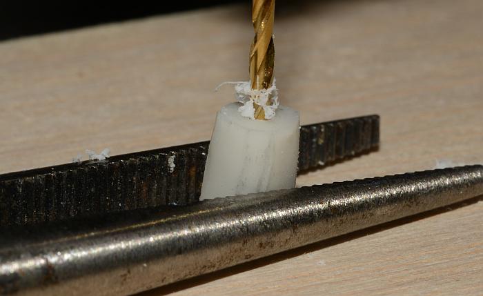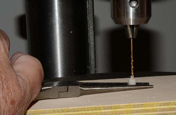 Next, while holding the eraser with a pair of needle-nose pilers, I VERY SLOWLY drilled a hole through the center. I chose a 1/32 inch drill bit which seemed to be slightly smaller than the outside diameter of the short tube that sticks out of the end of the Starset. This tube will receive the eraser. I destroyed the first eraser by drilling too fast, so for the second try, I took a full minute to drill through, that worked without destroying the project.