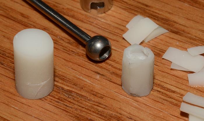 Next I used a Dremel to ream out a roughly spherical shaped depression in one end of the eraser. A spherical Dremel tool would have been a better choice but I didn't have one small enough so I used the next best tool I had available.