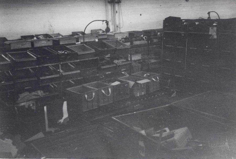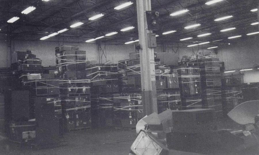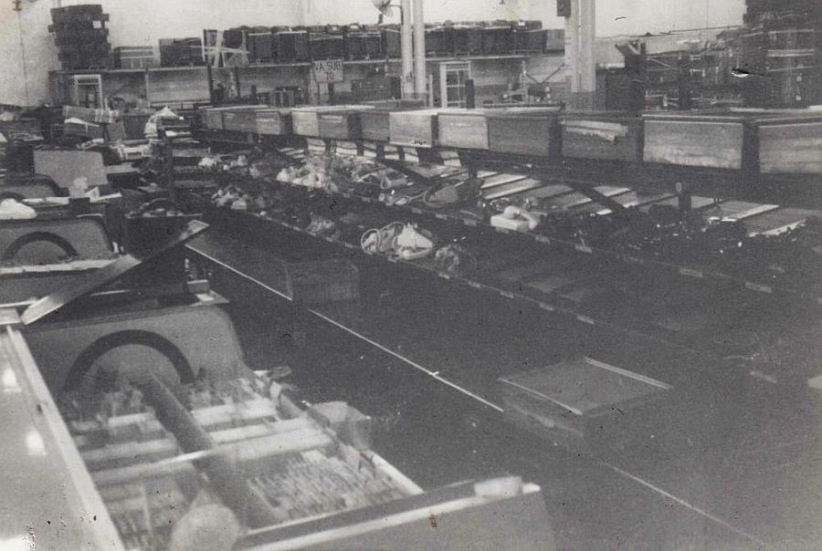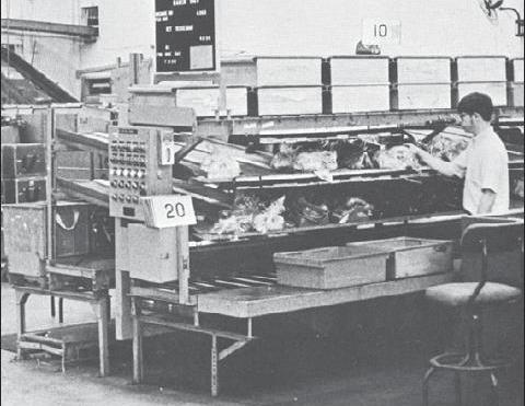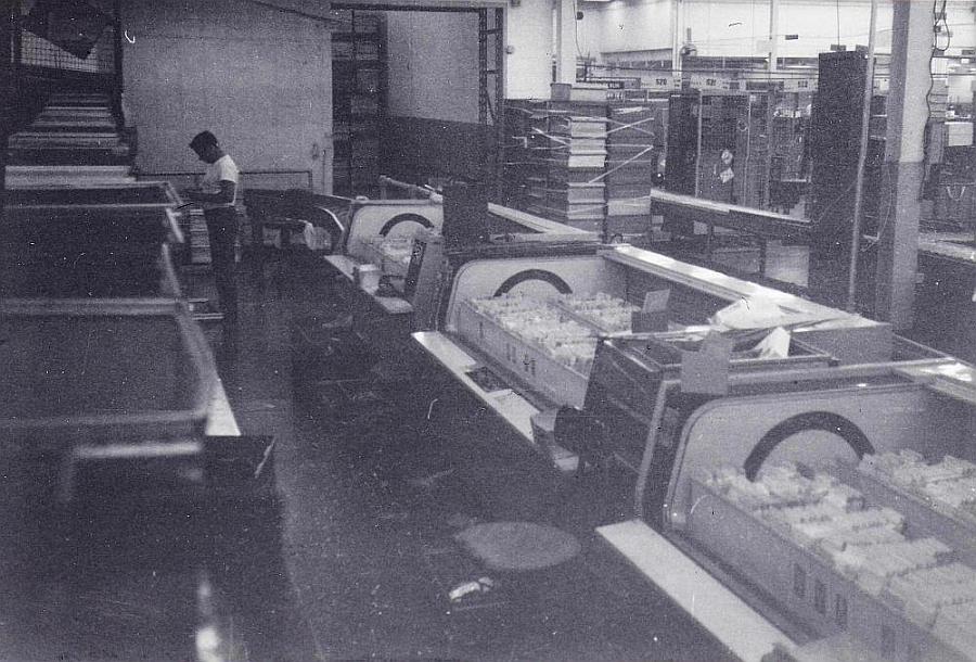 To the right is a view, taken from the same 1969 PR brochure as the blue picture above, of what the sorting area looked like when I first started. Two people would stand on the far side taking sets out of the shipping boxes, sort them and push them down the appropriate chute. A few months after I started, an additional conveyor was added which ran from about 50 feet to the left of the photo, then down the far side of the chutes to the end. This sped up the process more than tripling our capabilities.