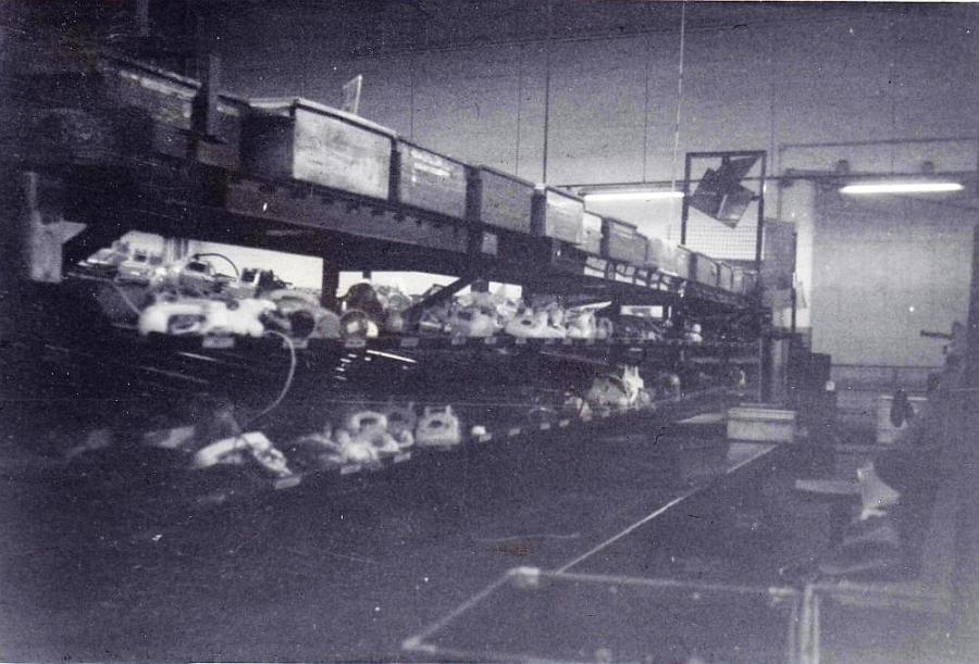 When we were moving along, it was about all 9 men could do to keep up with the flow. There were 3 men on each side of the chutes, and 3 taking sets out of bins and placing them on the new conveyor. The three on the upper side of the chutes were responsible for sorting phones into the correct chutes.