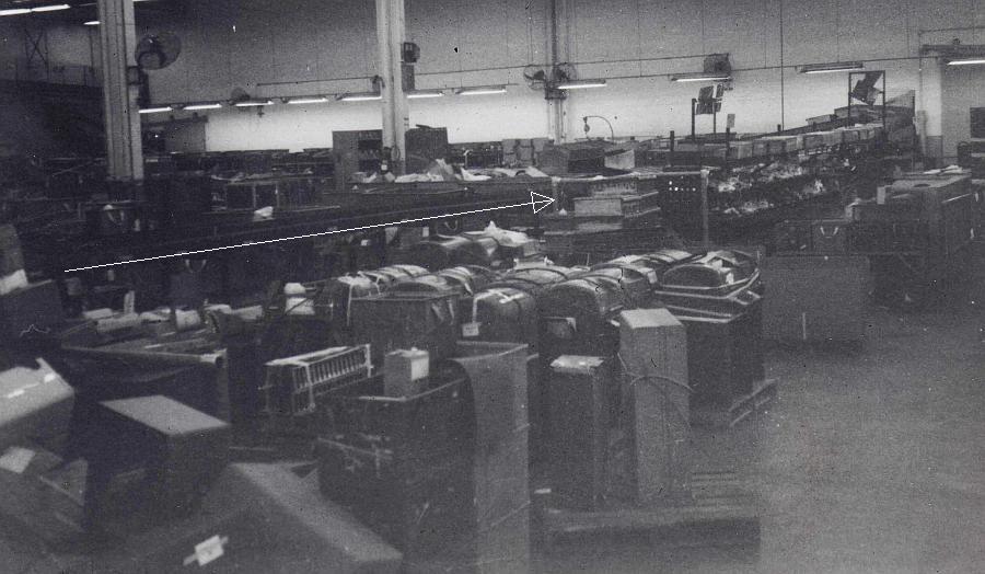 A metal tray was taken from the row above, 4 to 6 identical sets would be placed in the tray, a computer card from the bins on the left would be placed with each phone, and the full tray was placed on the conveyor below the slots, where it was checked by a hispanic guy who didn't speak English but caught every error we made, then on to the other side of the plant to be refurbished. All the phones ended up going along the conveyor, through the opening you can see in the top left of the above photo. That's when they ceased being property of C&P and became property of Western Electric.